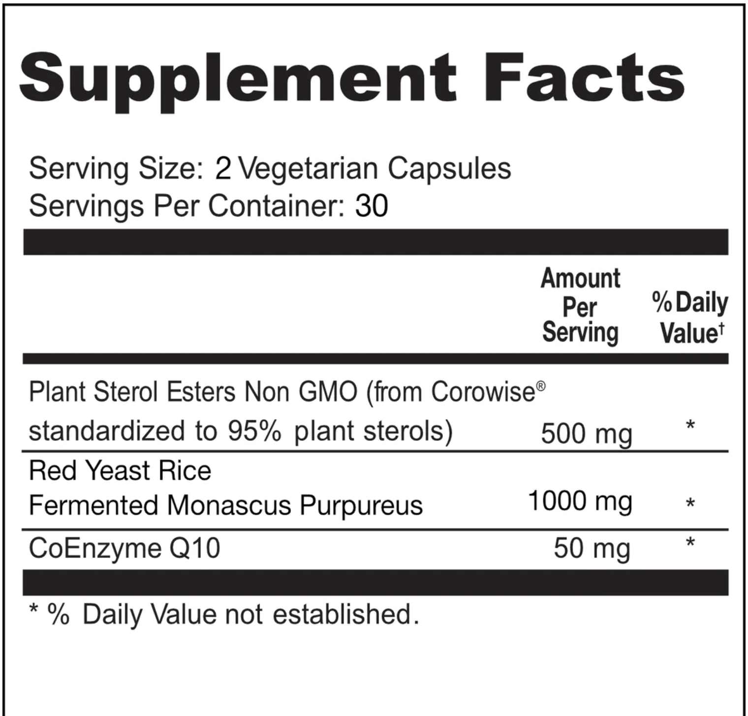 Plant Sterol Esters Non-GMO (from Corowise, standardized to 95% plant sterols), Red Yeast Rice (Fermented Monascus Purpureus), CoEnzyme 10. Other ingredients: Vegetarian Cellulose, Vegetable Stearate, Silica, Dicalcium Phosphate.