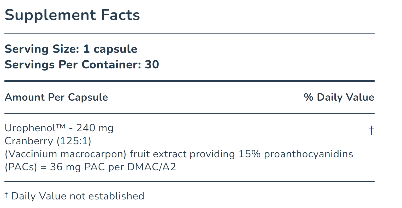 PACs (the bioactive component of cranberries) help stop harmful bacteria, such as E. coli, from sticking to the urinary tract wall and causing infections. The recommended dose of 36 mg of soluble PACs is necessary to maintain a healthy urinary tract, and is in each capsule of the Utiva Cranberry PACs.