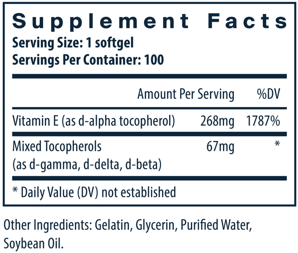 Vitamin E 400 (with mixed tocopherols) Supplement Facts / Ingredients Melissa June 19, 2025 21:59 Supplement Facts:Allergen Information:Contains soy.Free from gluten, dairy, peanuts, tree nuts, fish, shellfish, sesame, eggs, artificial flavors, colors, sweeteners, and unnecessary excipients. Comments 0 comments Article is closed for comments.